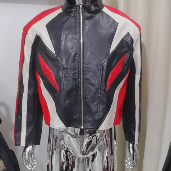Premium PU leather racer jacket with striking color block design and shoulder pads. Designer quality meets street edge.